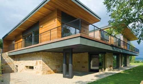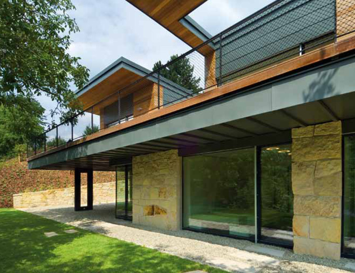 Modern house with sandstone tiled facade with cedar wood and titan-zinc accessory. The view of the house from driveway is inconspicuous. Youcan pass by and miss it, but if you come inside you will be amazed. "The house was a real challenge, exceptional, but complicated land and against this really generous clients requirements," says architect Rostislav Jakubecfrom the company ATX Architects.