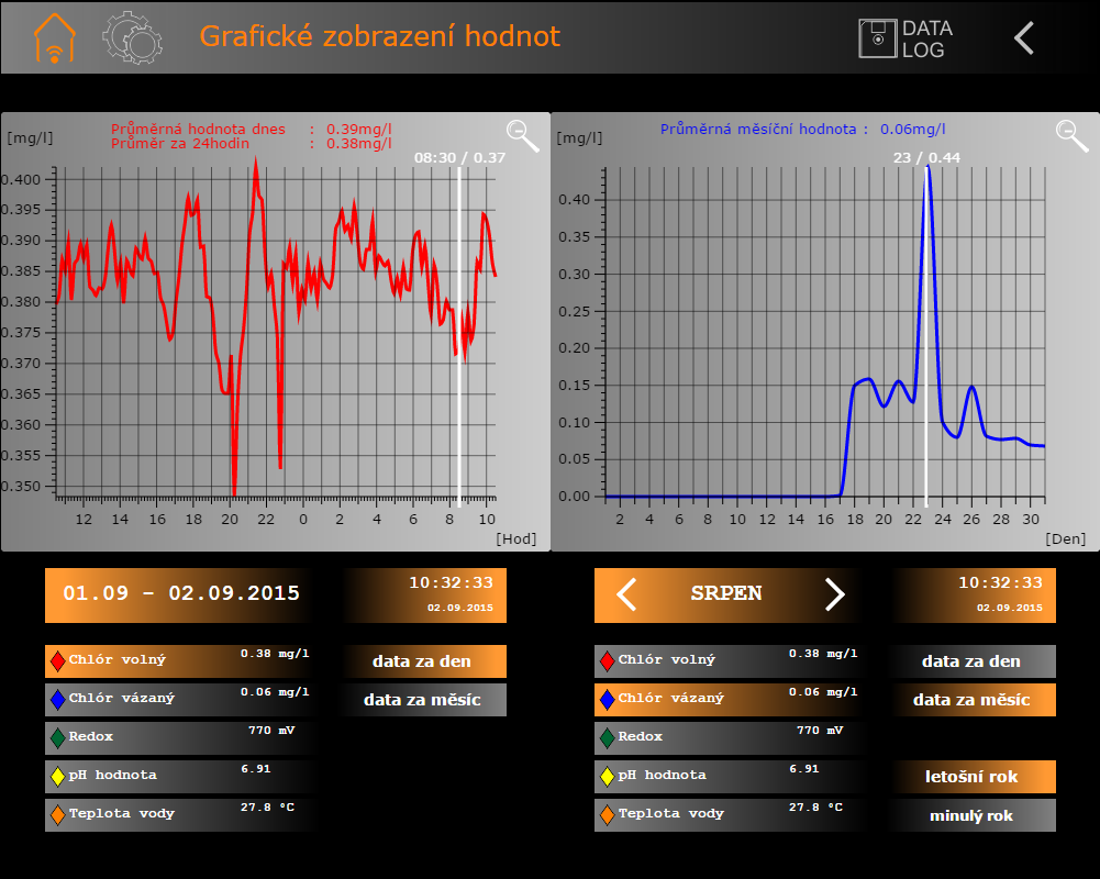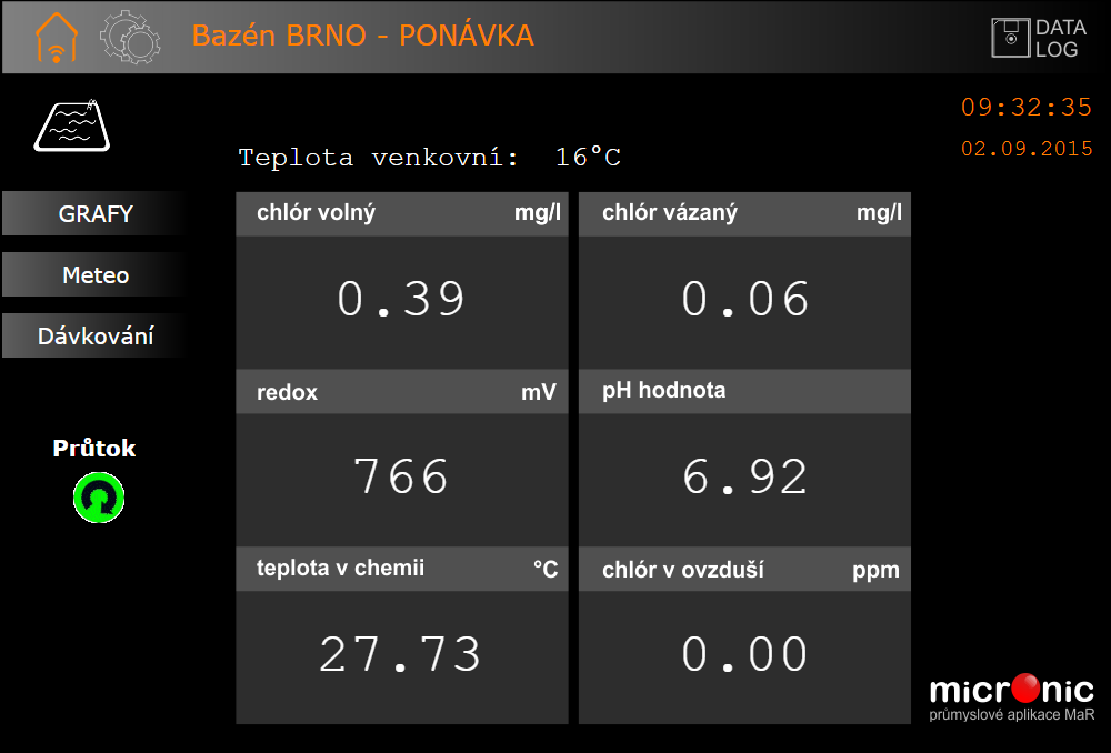 The visualization is created by software Mosaic with output as WEB page on computer of technical maintenance and the owner. Control software is the first implementation of the second generation of control technology for dosing chemistry to pools and includes new graphic features.