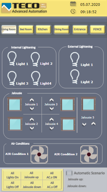 Thanks to our system, the inhabitants of the apartment have the opportunity to comfortably control not only its internal lighting, but also the outdoor lighting that is on its outer walls from one place by simply touching the screen. Furthermore, they can also control all air conditioning units located in the apartment, as well as blinds in all rooms of the apartment.