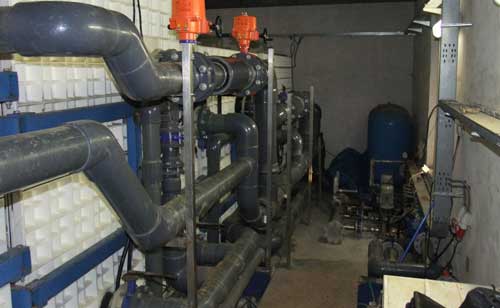 Control system consist of central module Foxtrot CP-1005 and I/O units for value measurment (water level, pressure in pipelines, pumps, ... and for controlling (valves in tanks, bypass, autimation of filter tank cleaning).