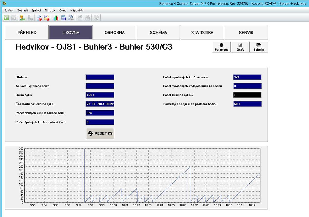 Zpracovaná data jsou dále poskytována nadřazenému systému Reliance verze 4.7.0. Ten je dále zpracuje. Pro každý monitorovaný stroj jsou k dispozici databáze, grafy, popř. další parametry, např. servisní. Pomocí skriptovacího nástroje jsou ve SCADA Reliance dále tvořeny statistiky. Ty slouží k celkovému přehledu o aktuální výkonnosti a výkonech provozů se stroji podle směn a dnů.