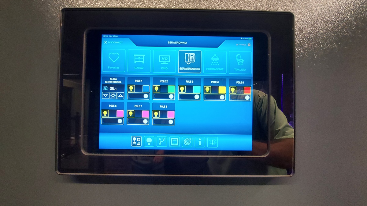 • řízení: osvětlení, vytápění, klimatizační jednotky, rolety, venkovní osvětlení, park, příjezdové cesty, světelné scény RGB v prostorách bazénu