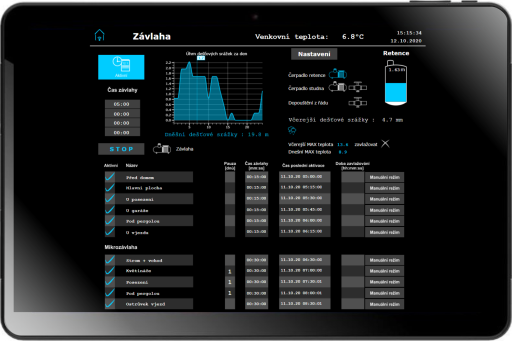 • přesné hlídání hladiny retenční nádoby v návaznosti na dešťové srážky a dopouštění ze studny, popř. domovního řádu