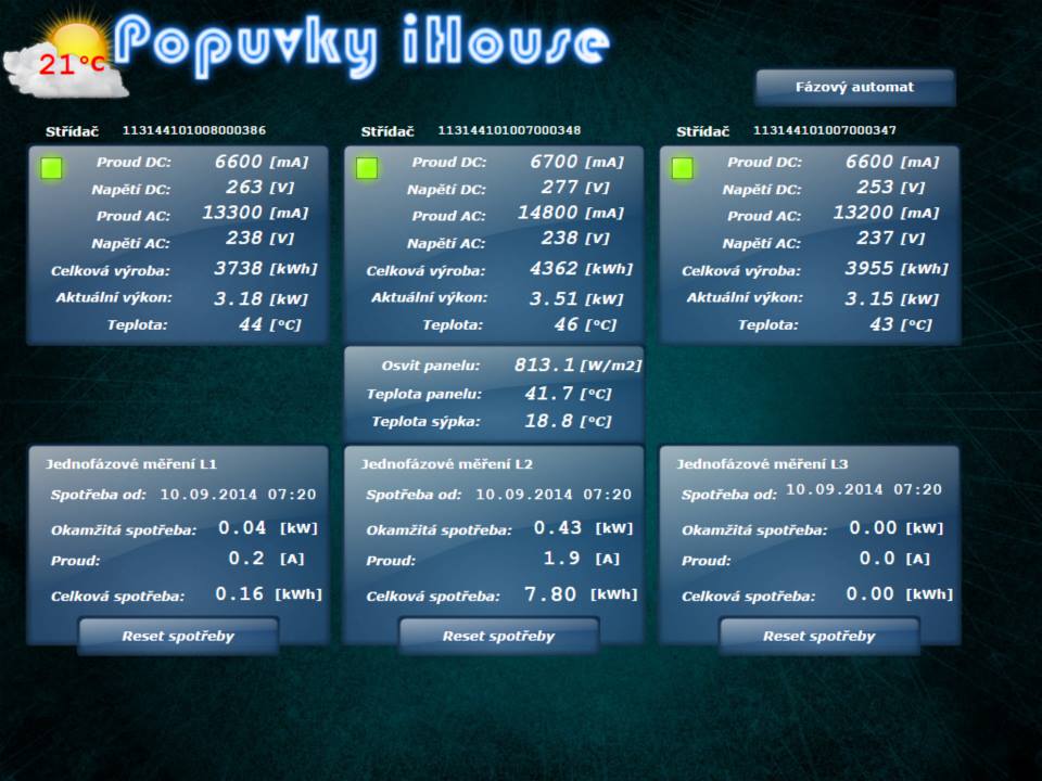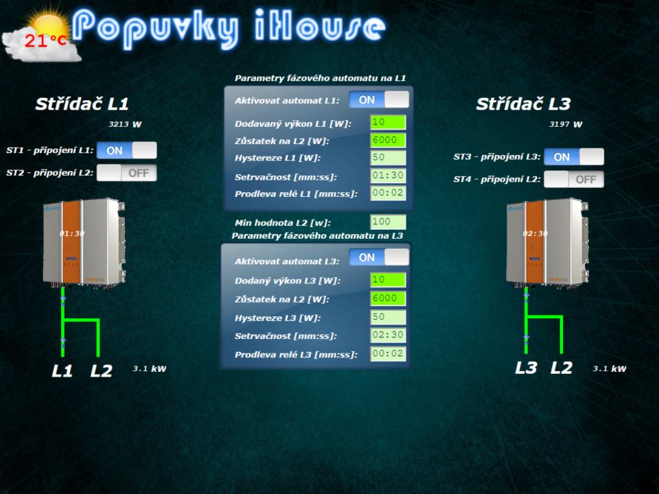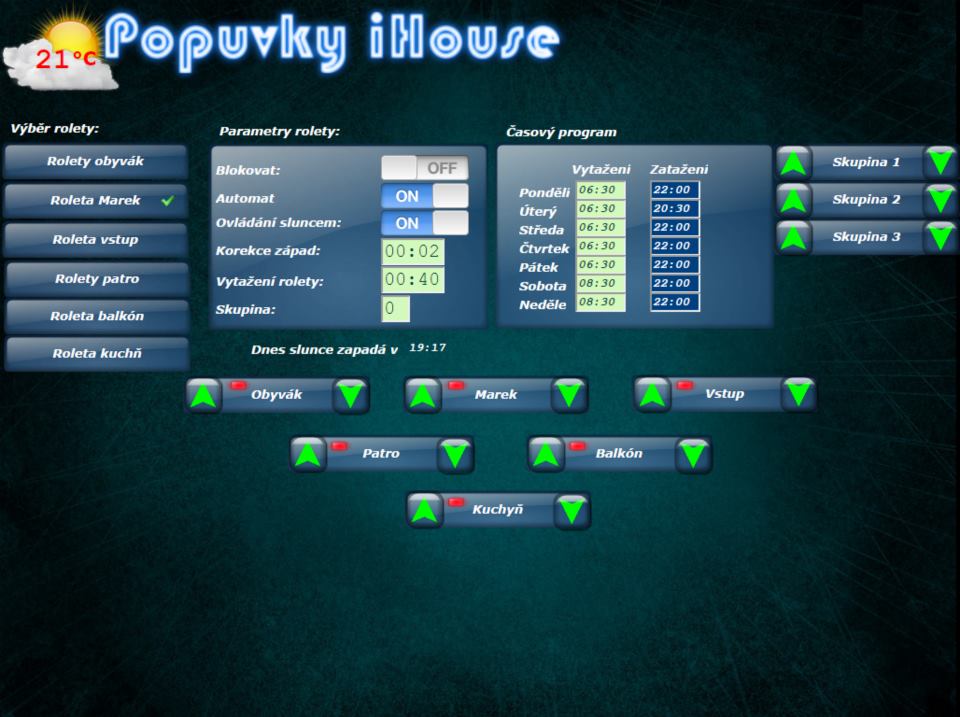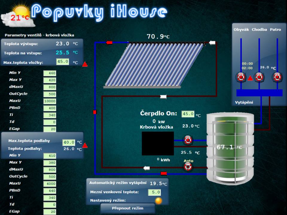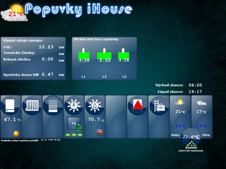 Řízení topného systému a ovládání žaluzií i rolet je v domech základní, často se opakující úlohou. Zde v rodinném domě v Popůvkách je i fotovoltaická elektrárna. Nahlédněme na ovládací obrazovky v pojetí firmy Axomer.