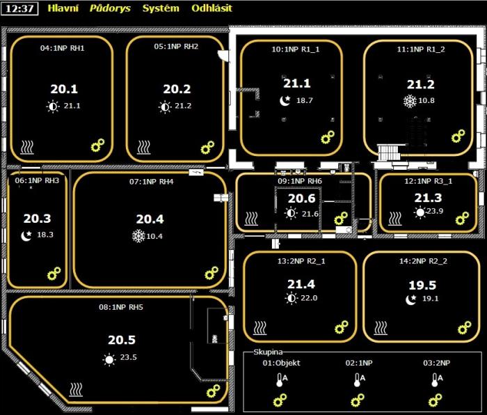 Topné panely v 11 topných zónách jsou ovládány stykači v pobočných el. rozvaděčích. K řízení stykačů slouží reléové výstupy systému Foxtrot na centrální jednotce CP-1016 a modulech C-OR-0008M. Teploty v zónách měří běžná odporová teplotní čidla svedená na vstupy na CP-1016.