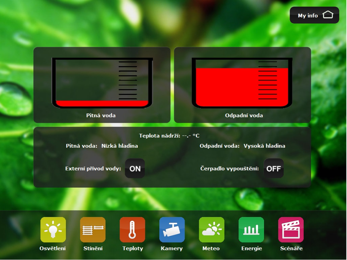 Ovládána jsou veškerá svítidla, rolety, zásuvky, zabezpečení, kamery a monitoruje spotřebu el. energie. Na míru bylo zapracováno rozšíření o funkce hlídání hladin v nádržích včetně signalizace kritických hodnot a ovládání vpustních a výpustních ventilů. Dálším rozšířením je nadstavba o stmívání DMX svítidel.