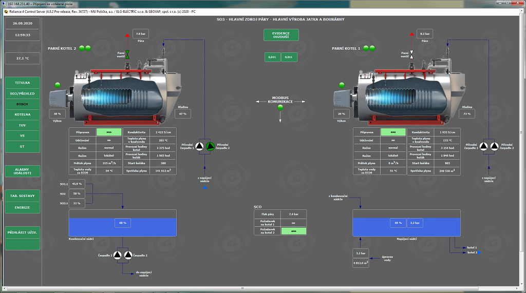 - 2 parní kotle Bosch (hlavní zdroje páry, komunikace přes Modbus)
