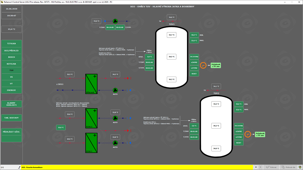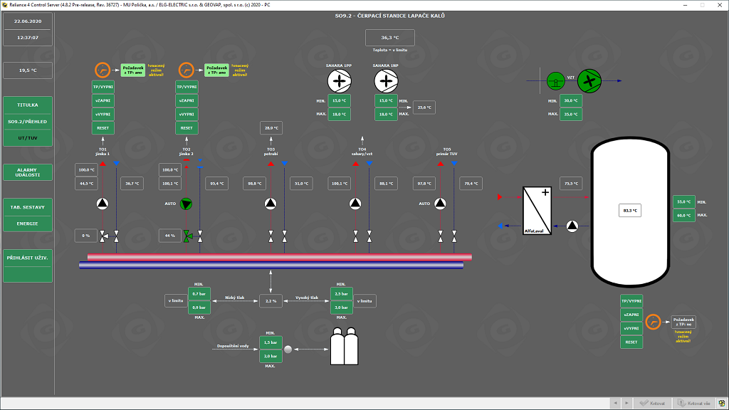 Na dispečerském počítači je nainstalován SCADA/HMI systém Reliance a je umístěn v dispečinku s nepřetržitým dohledem. Reliance získává data z jednotlivých PLC a prezentuje je v přehledných grafických schématech tak, aby obsluha byla okamžitě informována o stavu řízených technických zařízení a mohla řešit případné problémy.