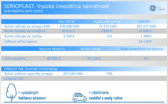 Ve výrobní hale společnosti Serioplast ve Slovenských Levicích proběhla v roce 2014 rekonstrukce osvětlení a původní osvětlení bylo nahrazeno úspornými LED svítidly ALBEO 147, řízenými našim systémem Tecomat Foxtrot. Instalaci tohoto pilotního projektu provedla společnost Light Project, s.r.o. a s výsledkem byl investor – společnost Serioplast velice spokojena.