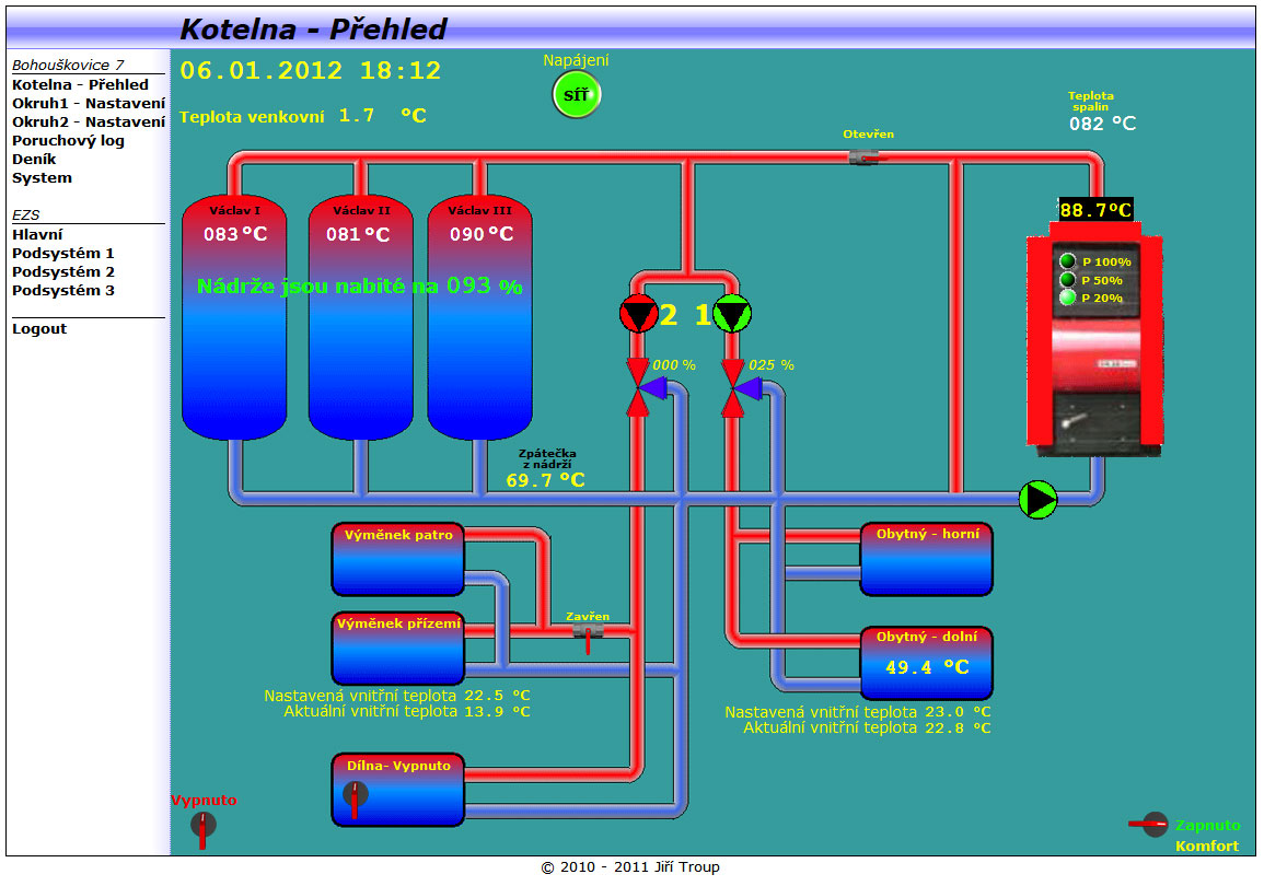 Řízení systému vytápění dvou nezávislých objektů z akumulační kotelny s kotlem na dřevoplyn. Realizace: Jiří Troup - Datanets