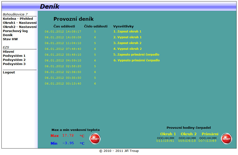 • pravidelná archivace dat  (teploty, provozní hodiny, meteodata, EZS)