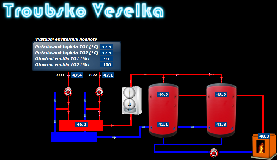 Vytápění s využitím více zdrojů energie. Cílem je automatické spuštění a řízení systému ÚT, s akumulací přebytků výkonu kotle na TP. V tomto případě je primární zdroj vytápění kotel na tuhá paliva, který energii akumuluje do dvou 1000l nádrží. Odtud je teplá voda distribuována podle požadavku systému (topit podle venkovní teploty) do dvou topných větví přes třícestné ventily (řízené PID).Těmi je výstupní teplota vody do radiátorů regulována a řízena ekvitermní regulací (dle ekvitermní křivky). Jako záloha je použit elektrokotel. Řízení výkonu elektrokotle je regulováno spínáním topných tyčí dle PID. Systém samozřejmě hlídá poruchové a poplachové stavy (přetopení, nízká teplota aku atd.), v případě potřeby zašle SMS a e-mail zprávu.