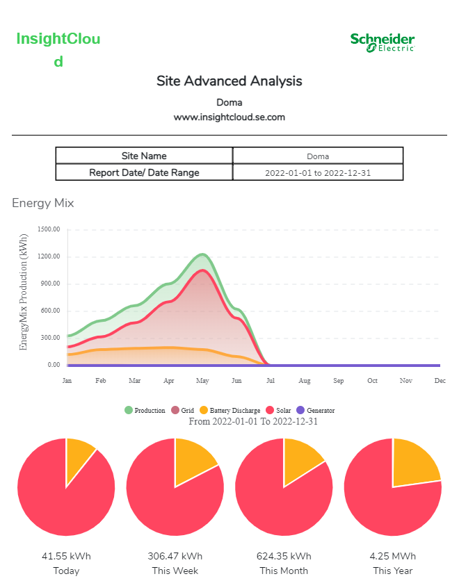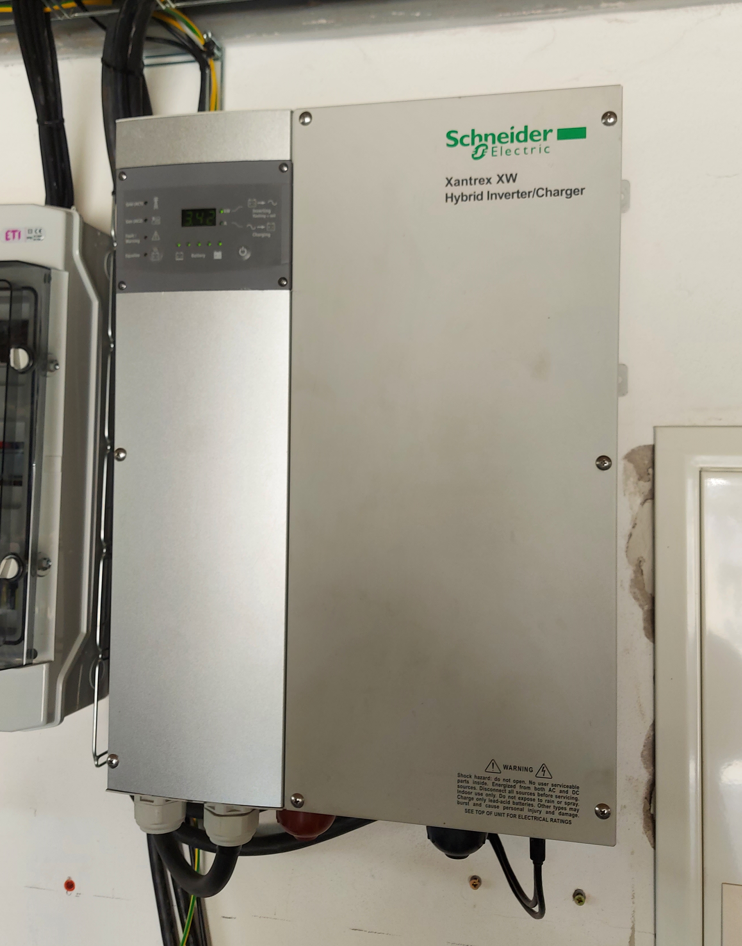 8 kW. 19 FV panelů o výkonu 6 kW je orientováno na východ a 6 FV panelů o výkonu 2 kW je orientováno na západ. Elektrárna byla doplněna střídačem Schneider Conext a bateriemi BYD o kapacitě 12 kWh.